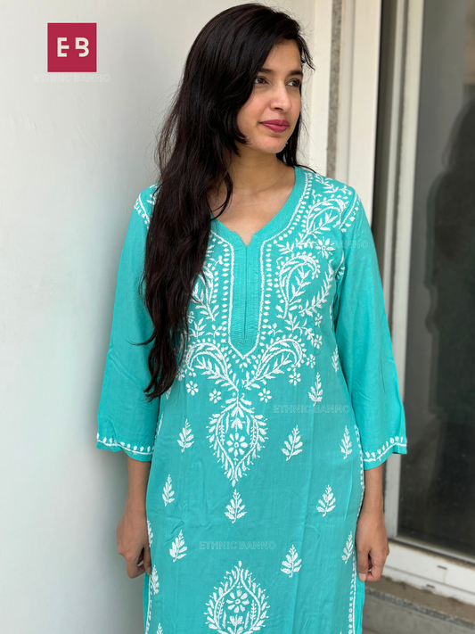 -56% OFFTeal Chikankari Rayon Long Kurti